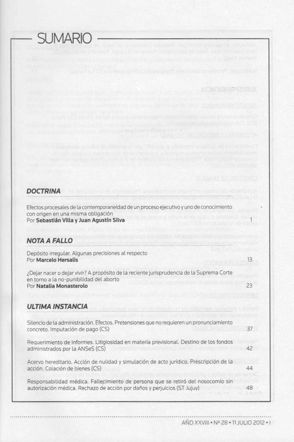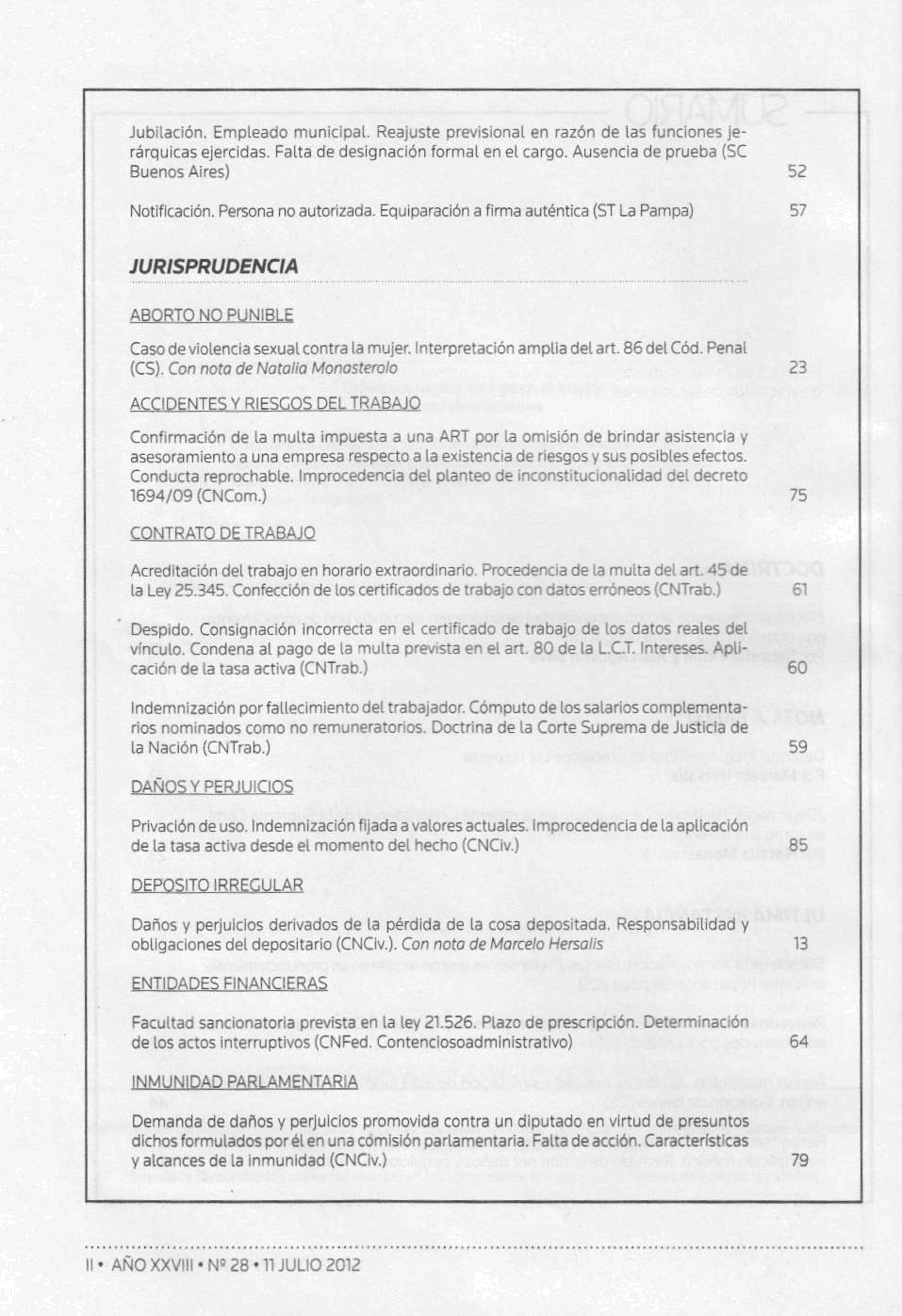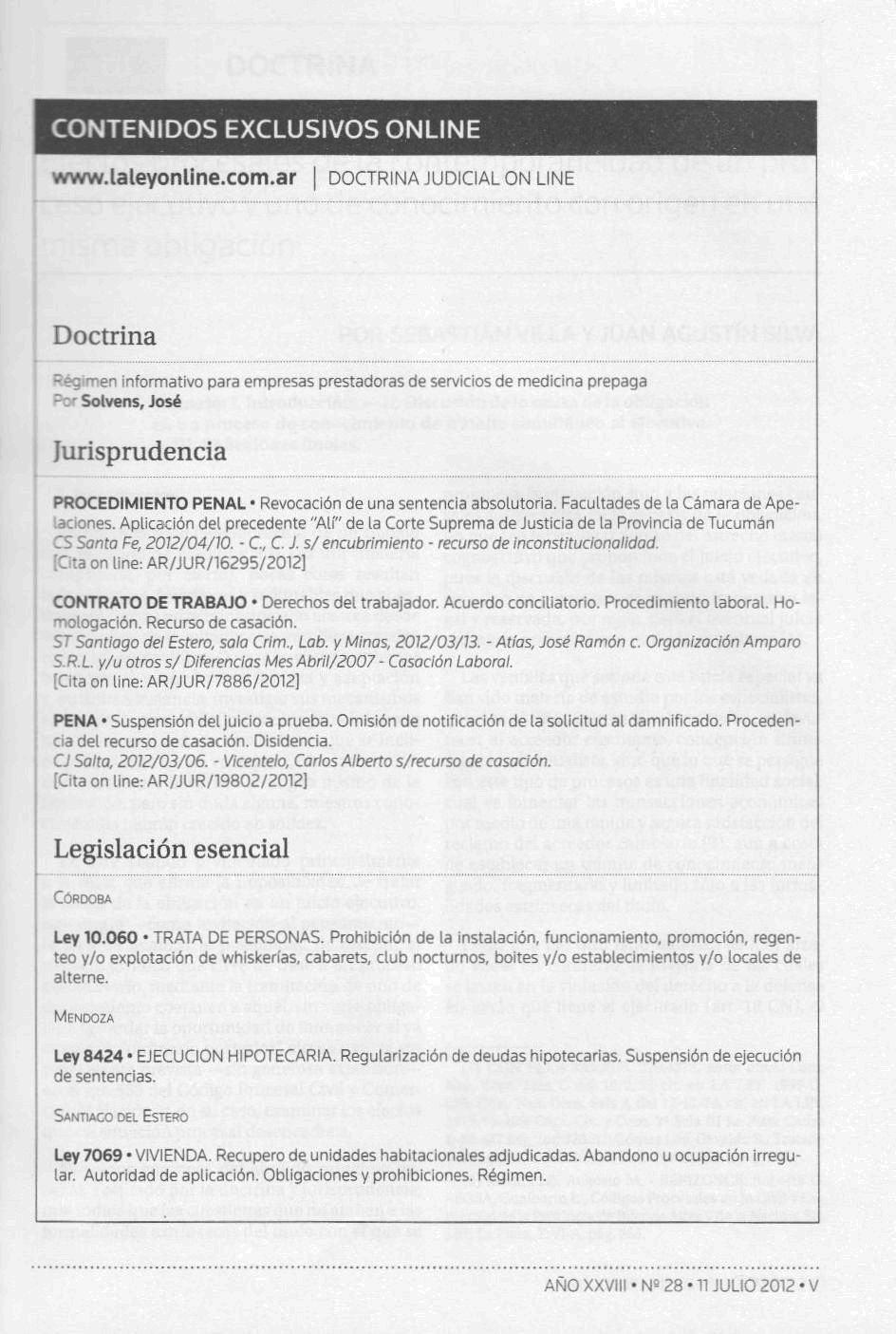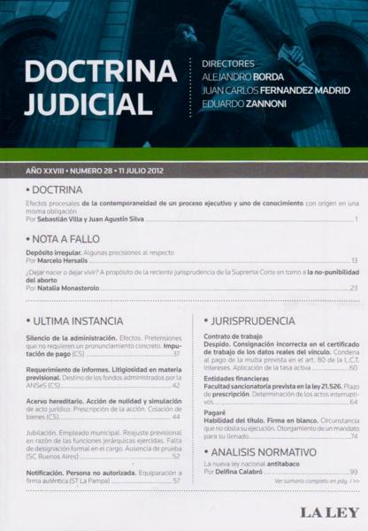 Doctrina judicial / Alejandro Borda ; Juan Carlos Fernández Madrid ; Eduardo A. Zannoni, directores ; Fulvio Germán Santarelli, subdirector. -- Año 28, no. 28 (jul. 2012). -- Buenos Aires : La Ley, impresión 2012. 104 p.; 24 cm.
