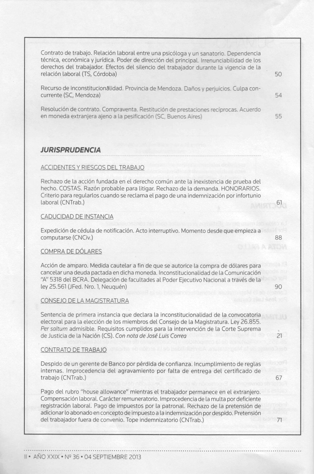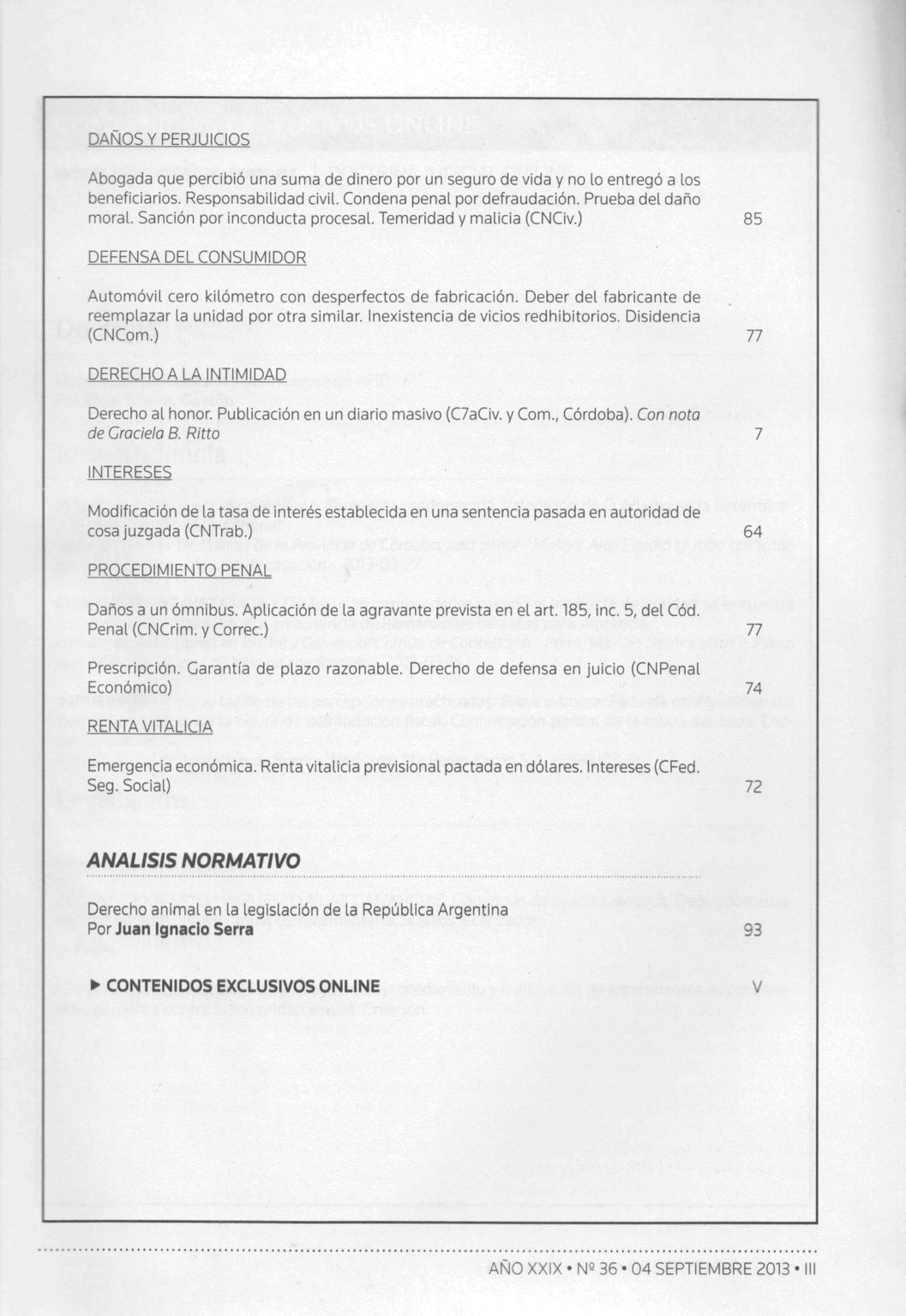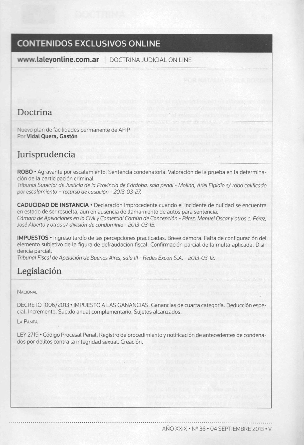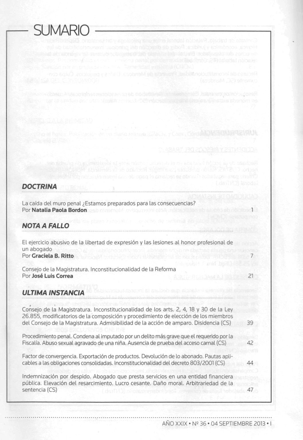 Doctrina judicial / Alejandro Borda ; Juan Carlos Fernández Madrid ; Eduardo A. Zannoni, directores ; Fulvio Germán Santarelli, subdirector. -- Año 29, no. 36 (sep. 2013). -- Buenos Aires : La Ley, impresión 2013. 99 p.; 24 cm.