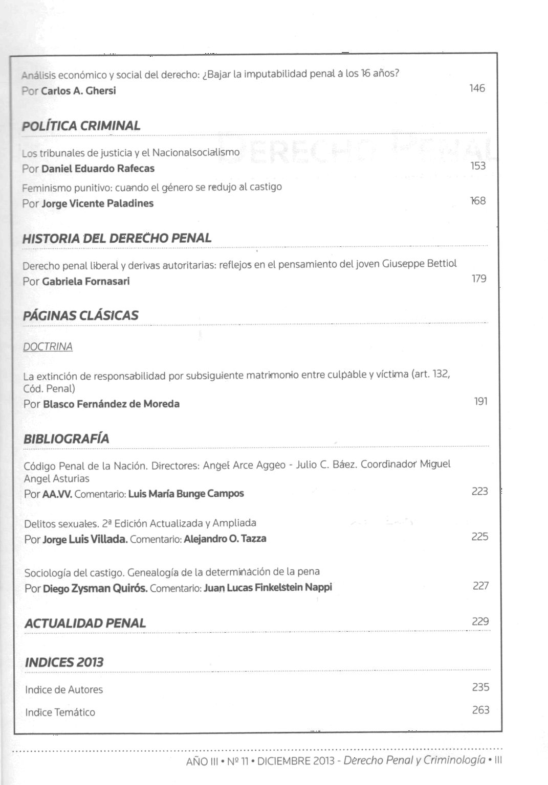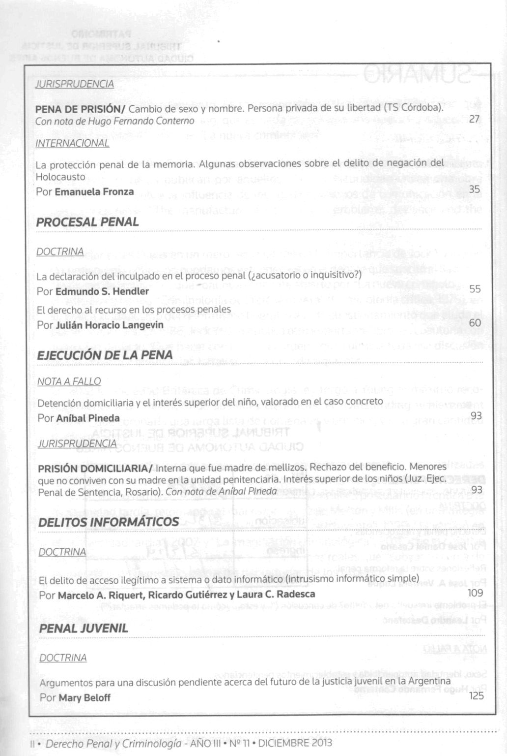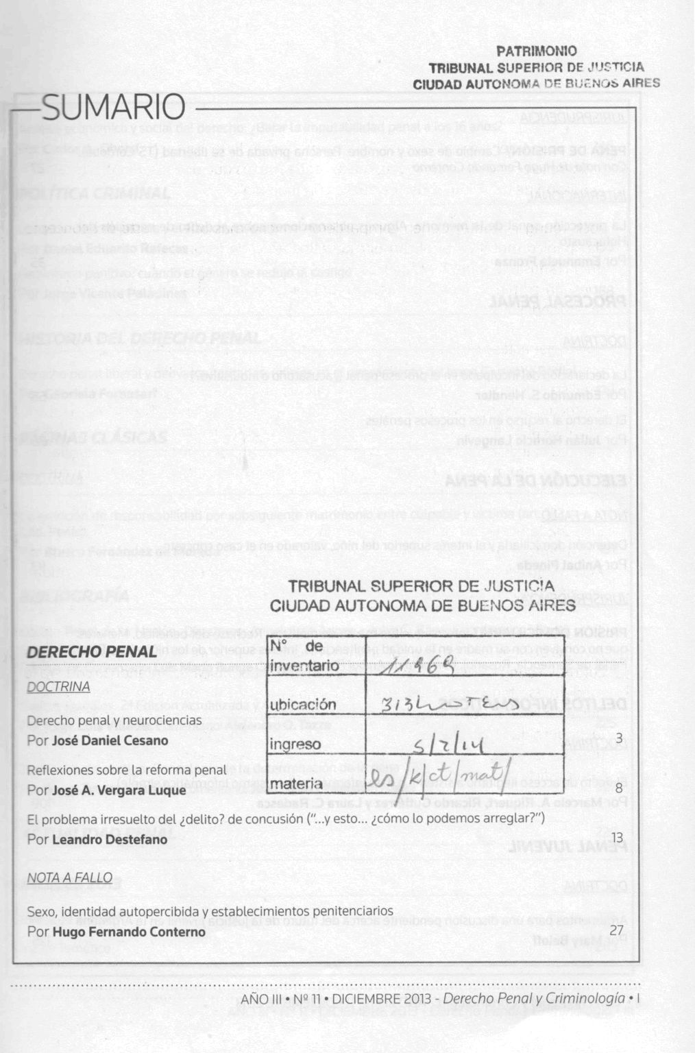 | Notas | Incluye secciones: [Derecho penal, Criminología, Proceso penal, Ejecución de la pena, Garantías constitucionales, Delitos económicos, Contravencional y de faltas, Historia del Derecho penal, Páginas clásicas, Bibliografía, Actualidad penal]. Incluye [Índice anual 2013, de autores y temático].