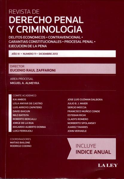 Revista de derecho penal y criminología / Eugenio Raúl Zaffaroni, dir. -- Año 3, no. 11 (dic. 2013). -- Buenos Aires : La Ley, impresión 2013. iii, 273 p.; 24 cm.