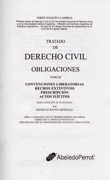 Llambías, Jorge Joaquín (1911-1982) Tratado de derecho civil: obligaciones, tomo III / Jorge Joaquín Llambías (1911-1982) ; Patricio J. Raffo Benegas, actualización. -- 6a. ed., actualizada. -- Buenos Aires : Abeledo-Perrot, impresión 2012. 560 p.; 26 cm. -- (Tratado de derecho civil: obligaciones / Jorge Joaquín Llambías ; 3)