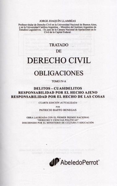 Llambías, Jorge Joaquín (1911-1982) Tratado de derecho civil: obligaciones, tomo IV-A / Jorge Joaquín Llambías (1911-1982) ; Patricio J. Raffo Benegas, actualización. -- 4a. ed., actualizada. -- Buenos Aires : Abeledo-Perrot, impresión 2012. 507 p.; 26 cm. -- (Tratado de derecho civil: obligaciones / Jorge Joaquín Llambías ; 4-A)