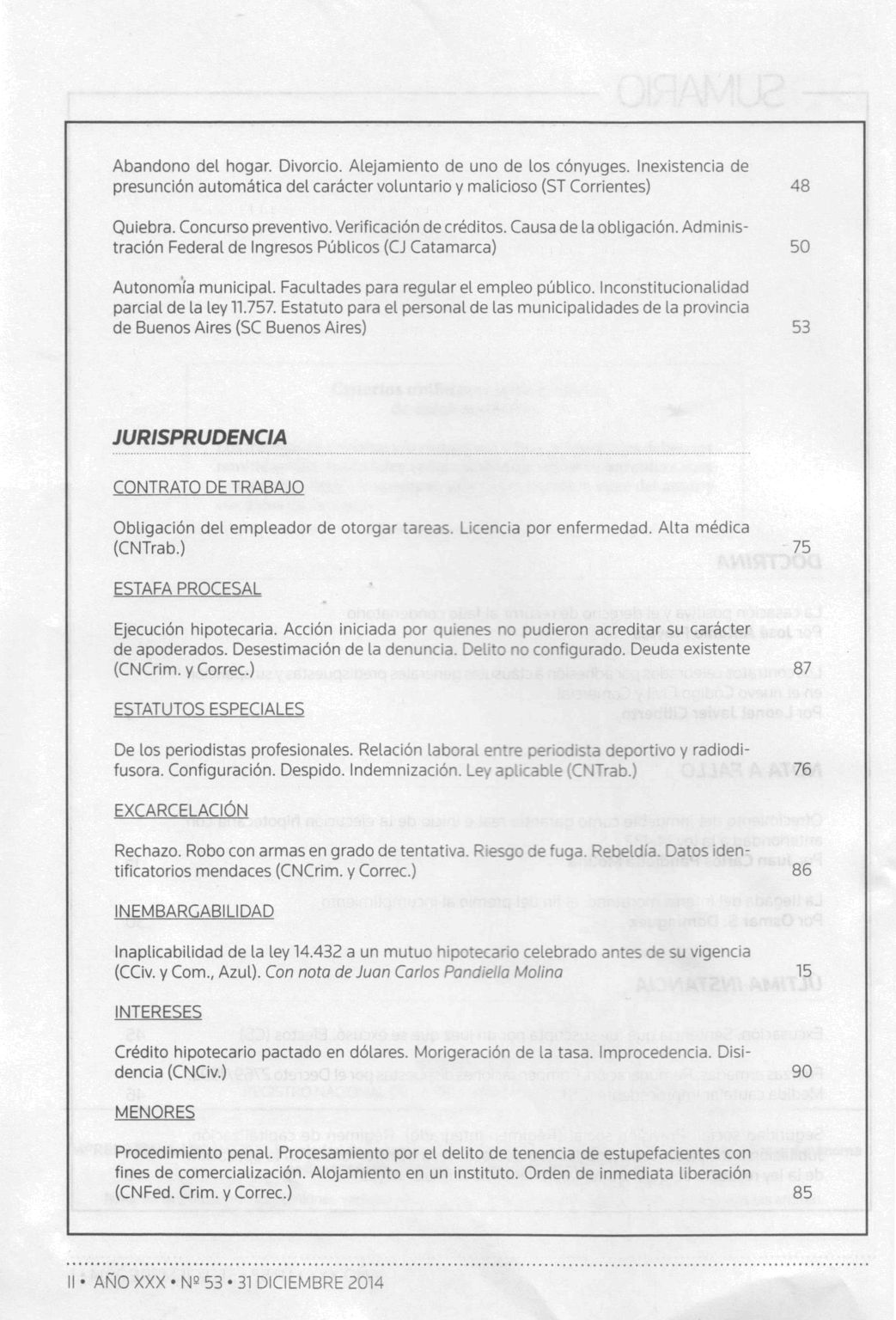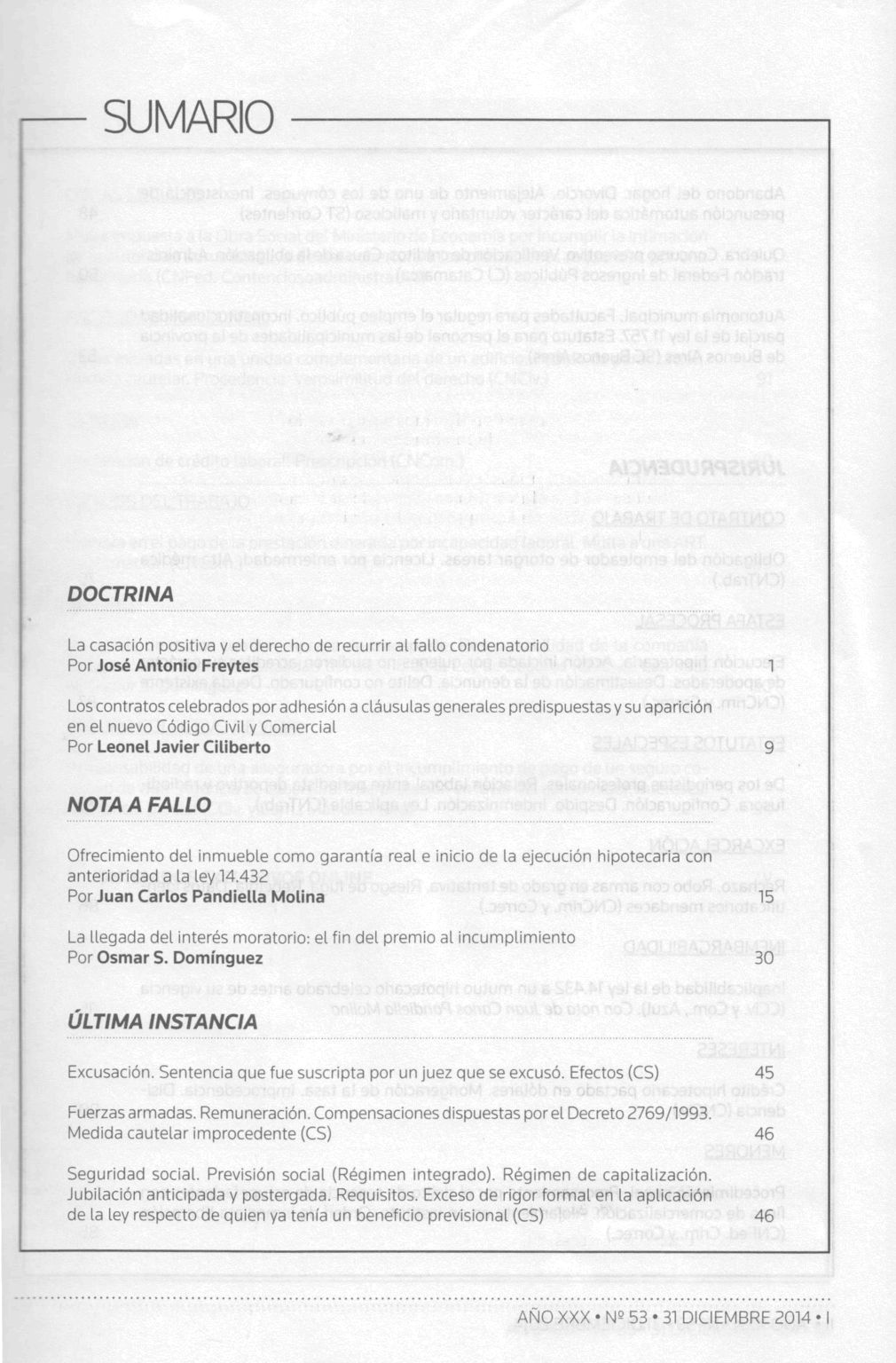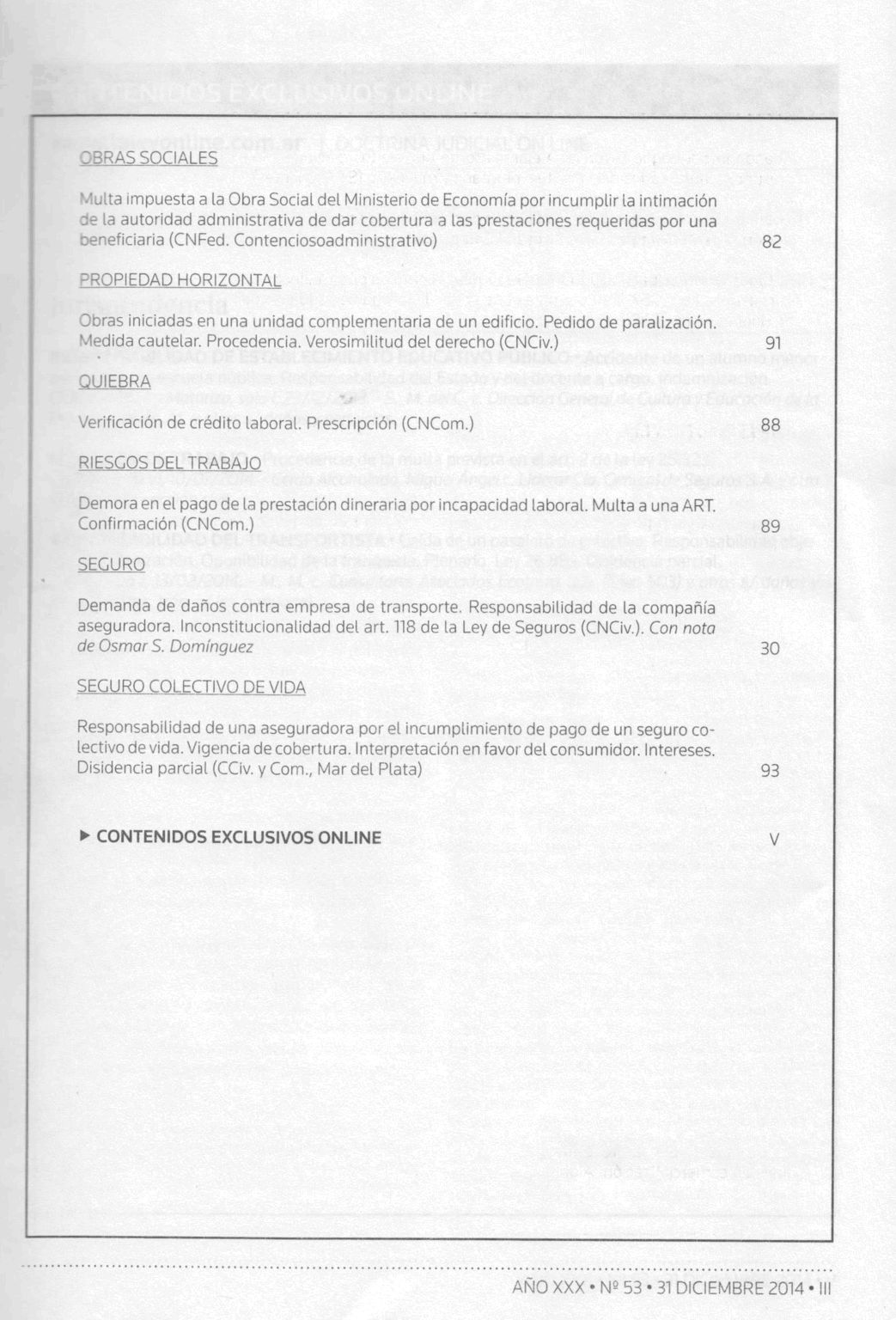 Doctrina judicial / Alejandro Borda ; Juan Carlos Fernández Madrid ; Eduardo A. Zannoni, directores. -- Año 30, no. 53 (dic. 2014). -- Buenos Aires : La Ley, impresión 2014. v, 101 p.; 24 cm.