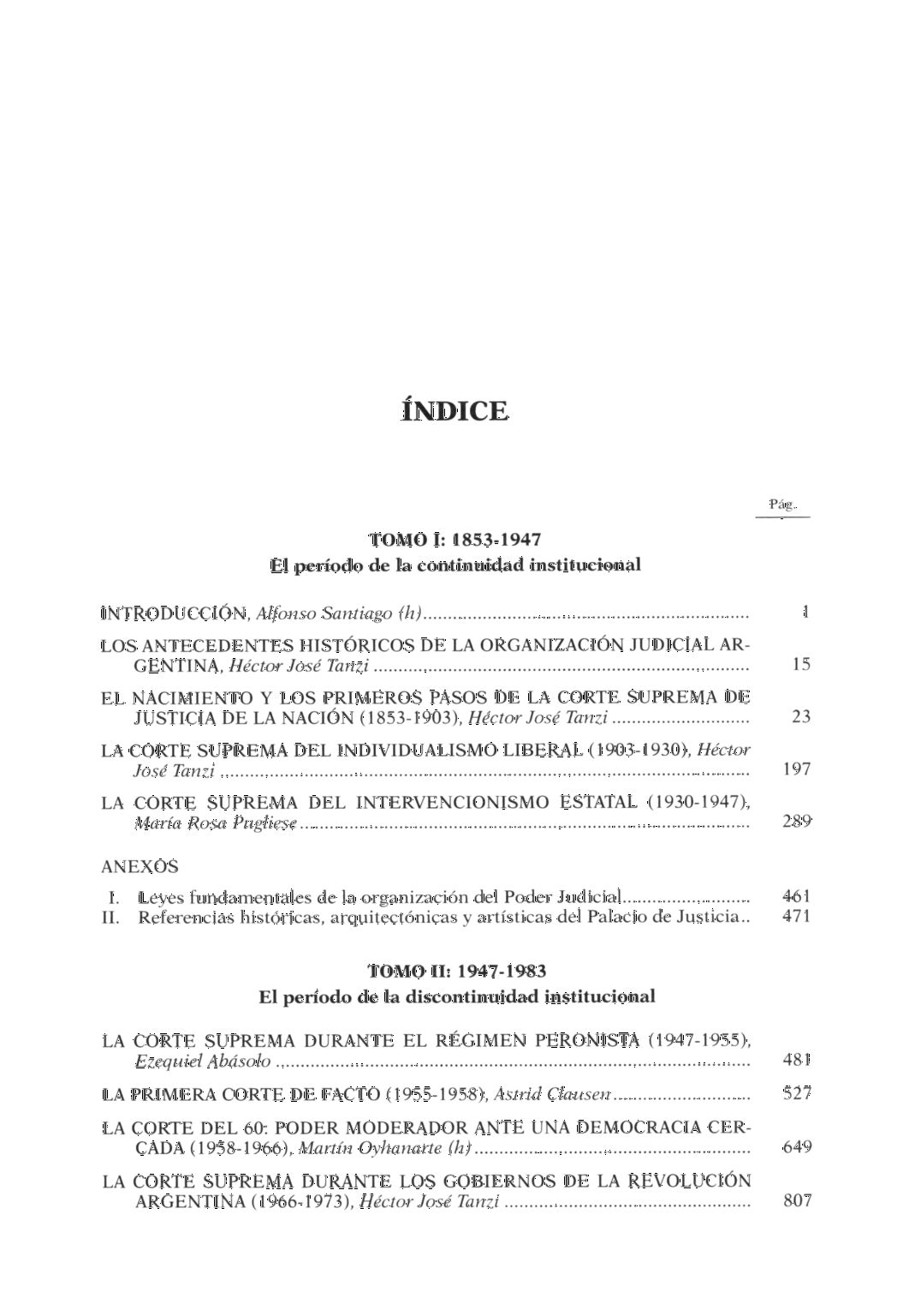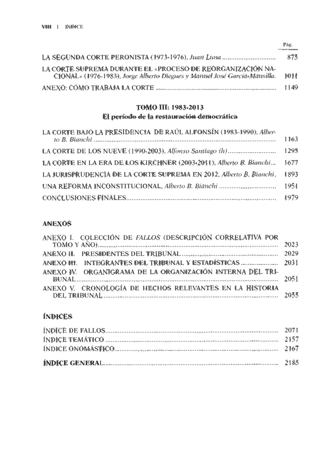 Historia de la Corte Suprema Argentina: tomo III, 1983-2013, el período de la restauración democrática / Alfonso Santiago (h) (dir.); Alfonso Santiago (h), Alberto B. Bianchi; Luciano Calero (coord.). -- Buenos Aires : Marcial Pons Argentina, 2014. vi, p. 1164-2212 : il.; 24 cm. -- (Historia de la Corte Suprema Argentina / Alfonso (h.) Santiago ; 3)