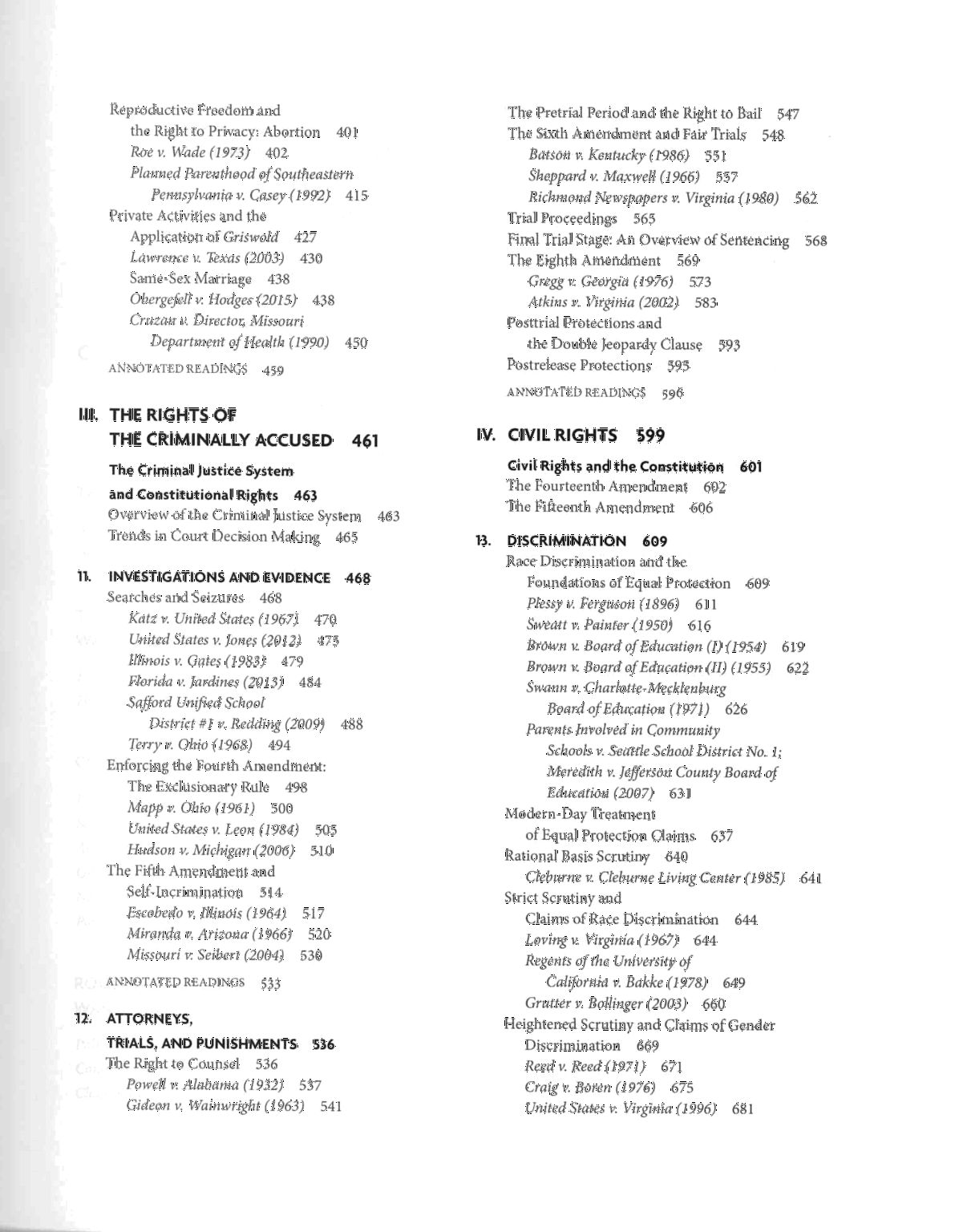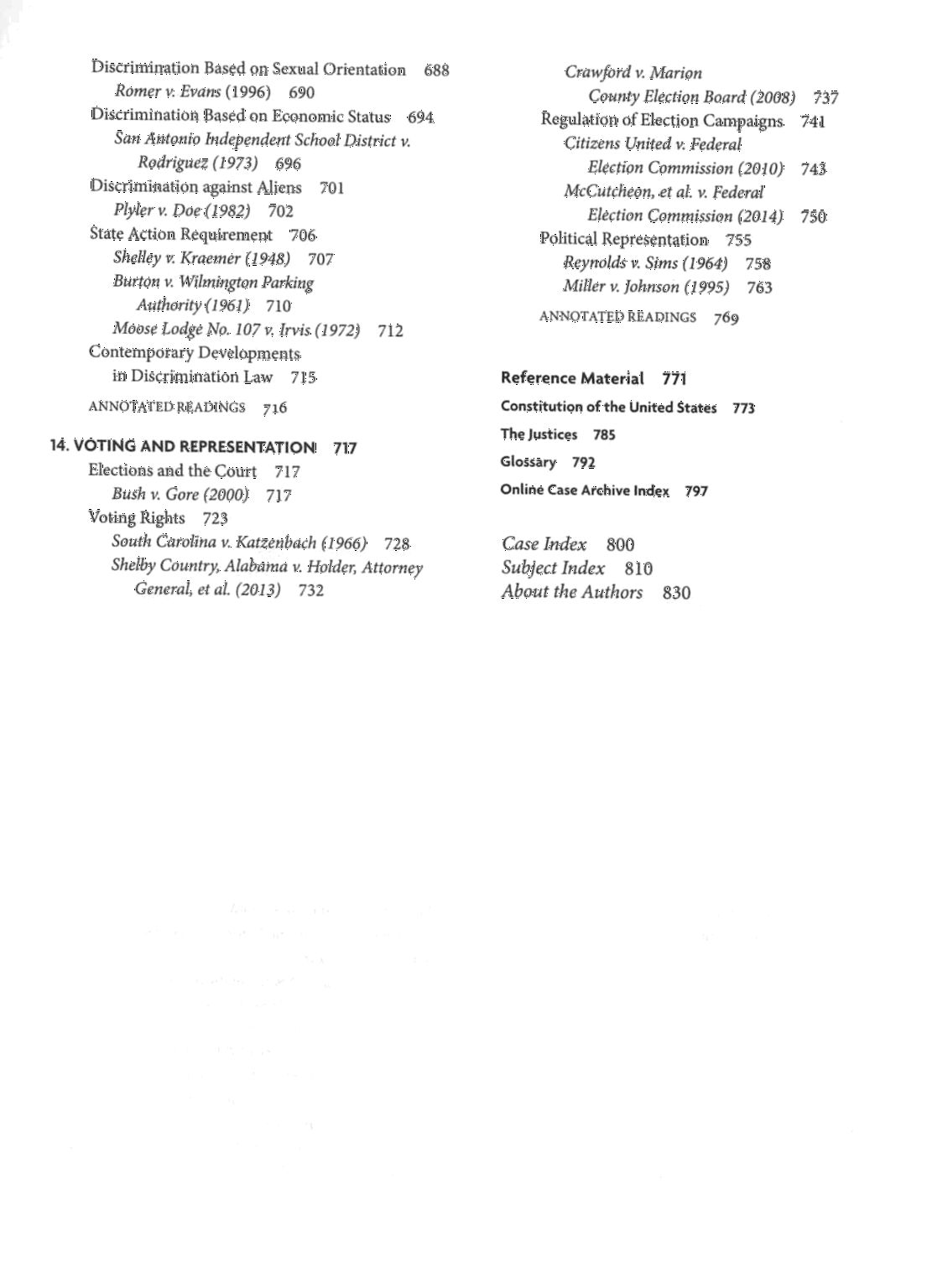 Incluye índice de tablas, ilustraciones y cuadros; tabla cronológica de casos; Constitución de Estados Unidos; listado de jueces de la Corte Suprema de Justicia de Estados Unidos; glosario; índice de archivos de casos en línea; índice de casos; índice de temas. ISBN: 978-1-4833-8401-6