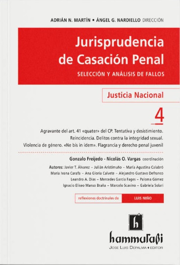 Jurisprudencia de casación penal: justicia nacional, selección y análisis de fallos, 4 / Adrián N. Martín, Ángel G. Nardiello, dir.; Gonzalo Freijedo, Nicolás O. Vargas, coordinación; autores Javier T. Álvarez... [et al.]; reflexiones doctrinales de Luis Niño. -- Buenos Aires : Hammurabi, impresión 2017. 422 p.; 23 cm. -- (Jurisprudencia de casación penal: justicia nacional, selección y análisis de fallos / Adrián N. Martín, Ángel G. Nardiello, dir. ; 4)