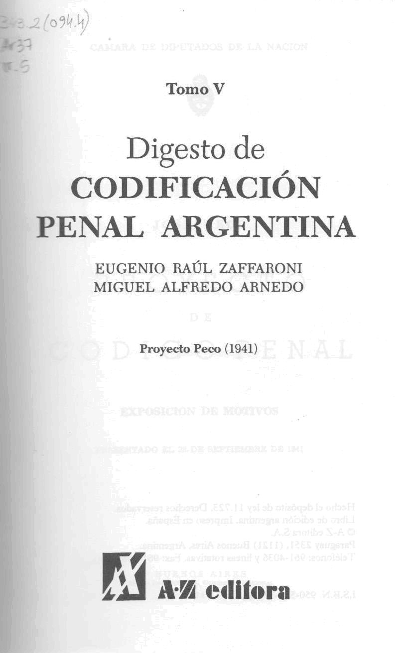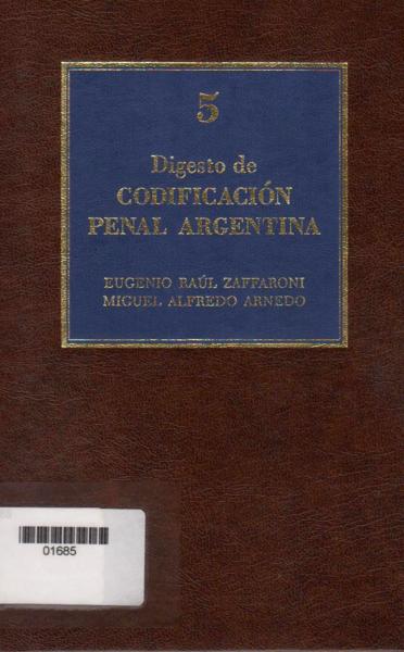 Argentina Digesto de codificación penal argentina: tomo V / Eugenio Raúl Zaffaroni, Miguel Alfredo Arnedo. -- Buenos Aires : A-Z, impresión 1996. 758 p.; 24 cm. -- (Digesto de codificación penal argentina / Eugenio Raúl Zaffaroni, Miguel Alfredo Arnedo ; 5)