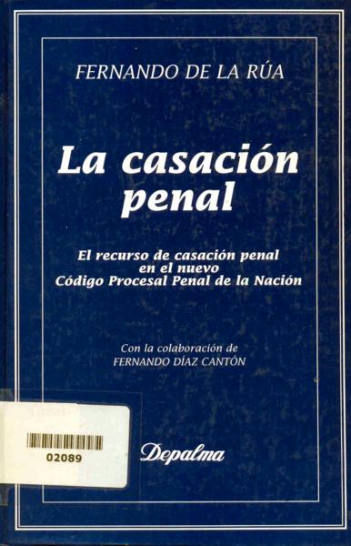 Rúa, Fernando de la (1937-2019) La casación penal: el recurso de casación penal en el nuevo Código procesal penal de la Nación / Fernando de la Rúa (1937-2019) ; Fernando Díaz Cantón, colaborador. -- 1a. ed., reimpr. -- Buenos Aires : Depalma, 1994 (reimpr. 2000). xvii, 466 p.; 20 cm.