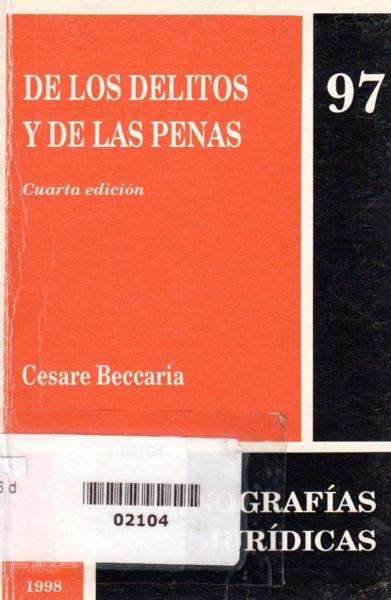 Beccaria, Cesare, Marchese di (1738-1794) De los delitos y de las penas / Cesare, Marchese di Beccaria (1738-1794). -- 4a. ed. -- Santa Fe de Bogotá : Temis, 1998. viii, 126 p.; 16 cm. -- (Monografías jurídicas ; 97) ISBN: 958-35-0178-6