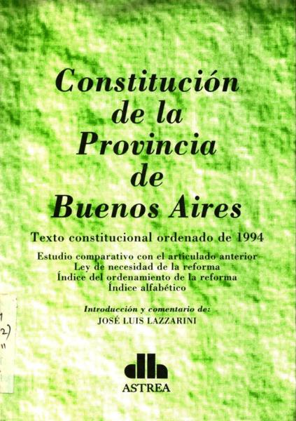 Buenos Aires (Argentina : Provincia) [Constitución] Constitución de la provincia de Buenos Aires: texto constitucional ordenado de 1994 / introducción de José Luis Lazzarini. -- Buenos Aires : Astrea, 1994. 195 p.; 21 cm.