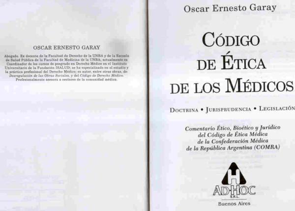Garay, Oscar Ernesto Código de ética de los médicos: doctrina, jurisprudencia, legislación. / Oscar Ernesto Garay. -- 1a. ed. -- Buenos Aires : Ad-Hoc, 2000. 573 p.