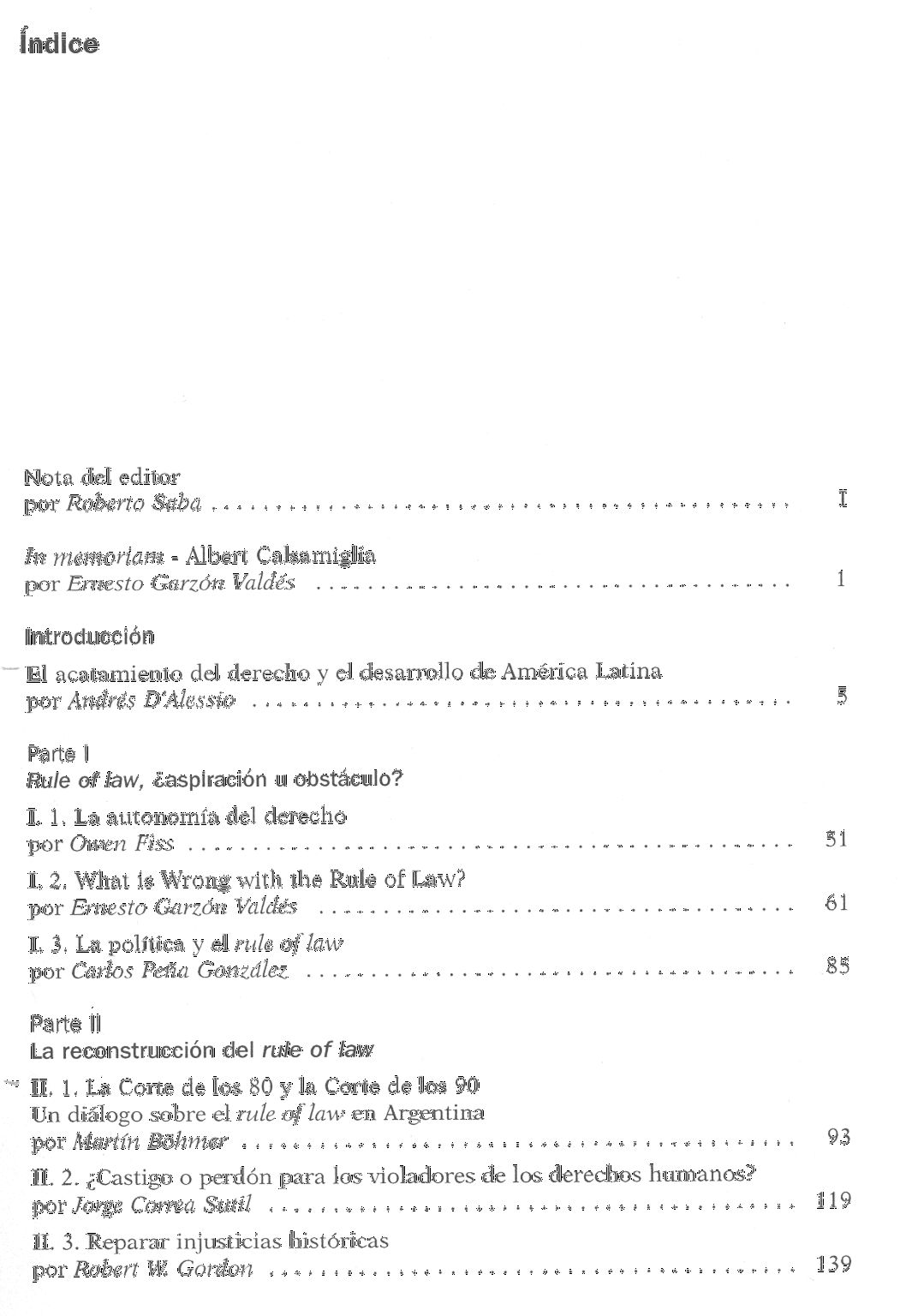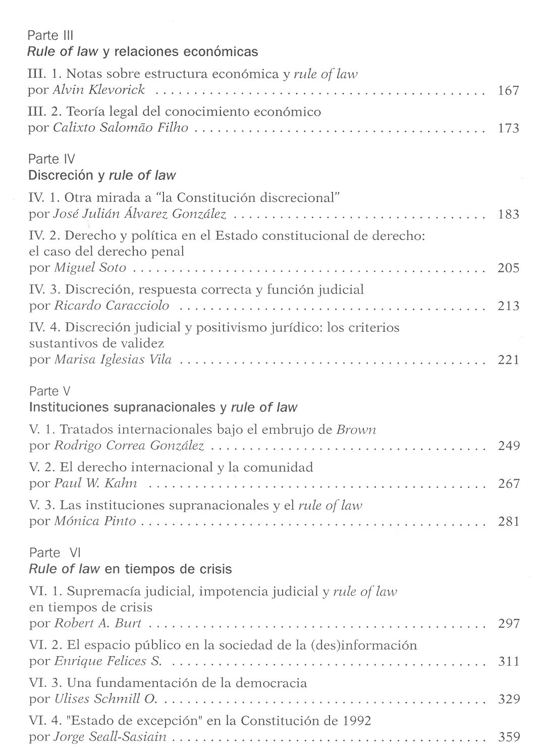 1. Estado de derecho (JURI) 2. ESTADO DE DERECHO (LE) 3. Democracia (JURI) 4. DEMOCRACIA (LE) 5. JERARQUIA NORMATIVA (LE) 6. AMÉRICA LATINA (LE) 7. AUTONOMÍA (LE) 8. CORTE SUPREMA DE JUSTICIA DE LA NACION (SAIJ) 9. Violación de los derechos humanos (JURI) 10. ECONOMÍA (LE) 11. Estado (JURI) 12. ESTADO (LE) 13. DERECHO PENAL (LE) 14. DISCRECION JUDICIAL (LE) 15. FUNCIÓN JUDICIAL (LE) 16. POSITIVISMO JURÍDICO (LE) 17. Validez (JURI) 18. DERECHO INTERNACIONAL (LE) 19. ORGANISMOS INTERNACIONALES (LE) 20. TRATADOS (LE) 21. Comunidad (JURI) 22. COMUNIDAD (LE) 23. PARAGUAY (LE) 24. Estado de sitio (JURI) 25. CONSTITUCIONES (LE) I. D'Alessio, Andrés José (1940-2009) II. Álvarez González, José Julián III. Böhmer, Martín IV. Burt, Robert A. V. Caracciolo, Ricardo VI. Correa González, Rodrigo VII. Correa Sutil, Jorge VIII. Felices, Enrique IX. Salomão Filho, Calixto X. Fiss, Owen XI. Kahn, Paul W. XII. Iglesias Vila, Marisa XIII. Garzón Valdés, Ernesto XIV. Gordon, Robert W. XV. Klevorick, Alvin XVI. Peña González, Carlos XVII. Pinto, Mónica XVIII. Seall-Sasiain, Jorge XIX. Schmill, Ulises XX. Soto, Miguel
