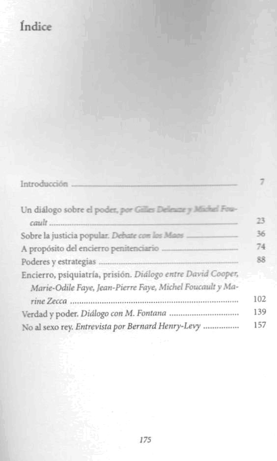 1. PODER (FILOSOFÍA) (LE) 2. JUSTICIA (FILOSOFÍA) (LE) 3. PRISIONES (LE) 4. NEUROPSIQUIATRÍA (LE) 5. VERDAD (LE) 6. SEXO (LE) 7. FOUCAULT, MICHEL, 1926-1984 - ENTREVISTAS (LE) 8. GÉNERO (Crea) I. Morey, Miguel, tr.