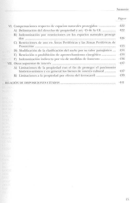 1. SUELOS - LEGISLACIÓN (LE) 2. ESPAÑA (LE) 3. PROTECCION DEL MEDIO AMBIENTE (LE) 4. Derecho de propiedad (JURI) 5. DERECHO DE PROPIEDAD (LE) 6. RESPONSABILIDAD PATRIMONIAL (SAIJ) 7. Expropiación forzosa (JURI) 8. EXPROPIACIÓN FORZOSA (LE) 9. INDEMNIZACIÓN (SAIJ) 10. CONSERVACIÓN DE LOS RECURSOS NATURALES (LE) I. Tolivar Alas, Leopoldo, pról.