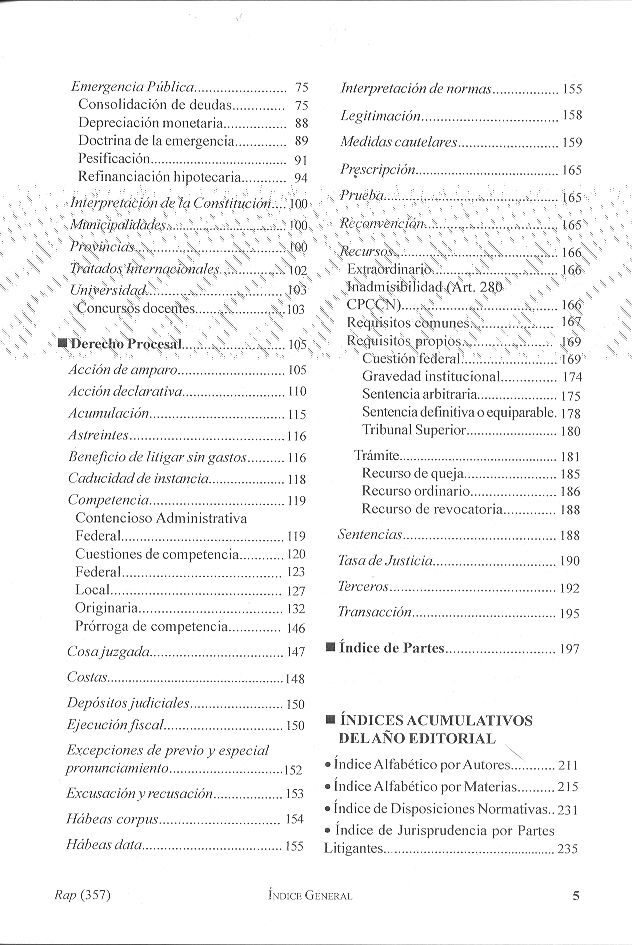 Incluye [Índices acumulativos del año editorial: alfabético por autores, alfabético por materias, de disposiciones normativas, de jurisprudencia por partes litigantes]. Incluye: [Compendio de Jurisprudencia de la Corte Suprema de Justicia de la Nación: octubre 2006 - septiembre 2007 / Mariana Díaz, María Agustina Fanelli Evans, Ana Salvatelli]. ISSN: 1666-4108