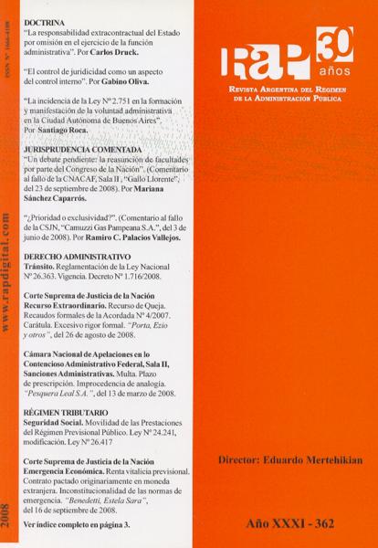 Revista Argentina del Régimen de la Administración Pública. -- Vol. 31, no. 362 (nov. 2008). -- Buenos Aires : RAP, 2008. 192 p.; 24 cm.