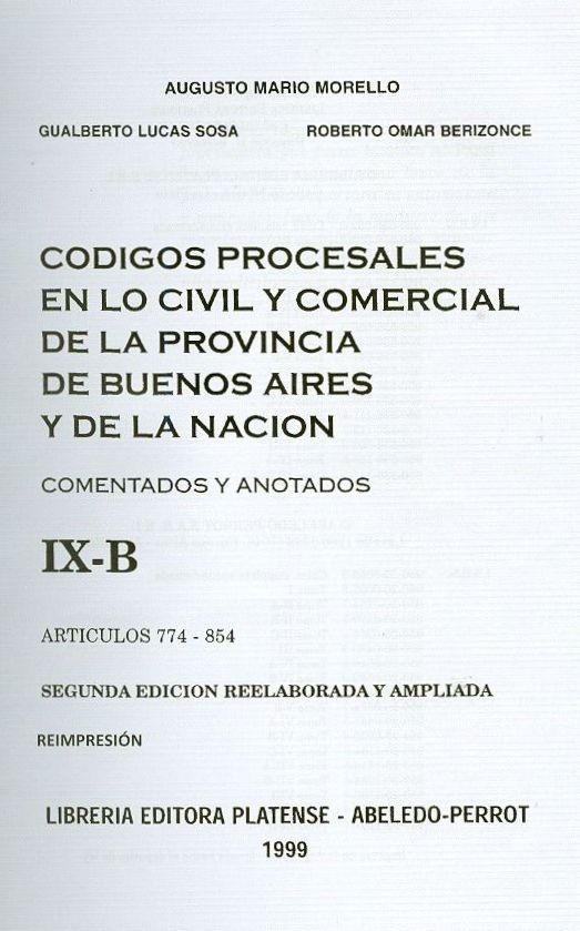 Morello, Augusto Mario (1926-2009) Códigos procesales en lo civil y comercial de la provincia de Buenos Aires y de la Nación: comentados y anotados, IX-B, artículos 774-854 / Augusto Mario Morello (1926-2009) ; Gualberto Lucas Sosa ; Roberto Omar Berizonce. -- 2a. ed. reelaborada y ampliada, reimpr. -- Buenos Aires : Abeledo-Perrot ; Librería Editora Platense, 1999 (reimpr. 2009). xiii, 542 p.; 22 cm. -- (Códigos procesales en lo civil y comercial de la provincia de Buenos Aires y de la Nación: comentados y anotados / Augusto Mario Morello ; 9 B)