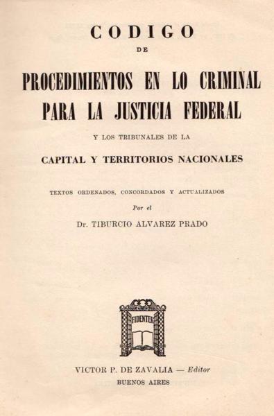 | Título | Código de procedimientos en lo criminal para la justicia federal y los tribunales de la Capital y territorios nacionales / textos ordenados, concordados y actualizados por Tiburcio Álvarez Prado |
