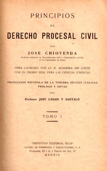 Chiovenda, Giuseppe (1872-1937) Principios de derecho procesal civil: tomo I / por José [i.e. Giuseppe] Chiovenda; tr. española de la 3a. ed. italiana, pról. y notas de José Casais y Santaló. -- Madrid : Instituto Editorial Reus, [1922?]. 751 p.; 23 cm. -- (Principios de derecho procesal civil / por José [i.e. Giuseppe] Chiovenda; tr. española de la 3a. ed. italiana, pról. y notas de José Casais y Santaló ; 1)