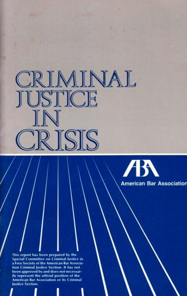 American Bar Association. Special Committee on Criminal Justice in a Free Society Criminal justice in crisis: a report to the American People and The American Bar on Criminal Justice in the United States, some myths, some realities, and some questions for the future / prepared by the Special Committee on Criminal Justice in a Free Society of the American Bar Association Criminal Justice Section. -- Washington : Amercian Bar Association. Criminal Justice Section, 1988. 77 p.; 23 cm.