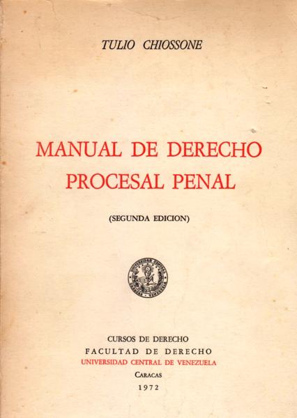 Chiossone, Tulio Manual de derecho procesal penal / Tulio Chiossone. -- 2a. ed. -- Caracas : Universidad Central de Venezuela. Facultad de Derecho, 1972. 495 p.; 23 cm.