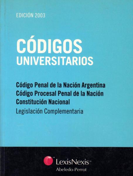 Argentina [Códigos] Código penal de la Nación Argentina, código procesal penal de la Nación, Constitución nacional / supervisados por Mario I. Chichizola. -- Buenos Aires : Lexis Nexis, impresión 2003. 509 p.; 18 cm. -- (Códigos universitarios)