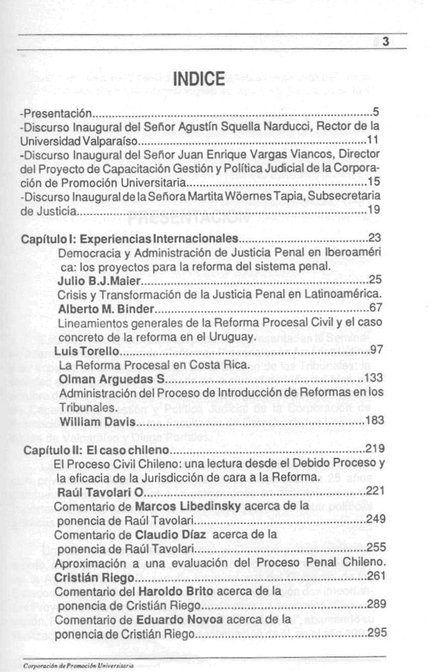 | Responsables Secundarios | Maier, Julio B. J. (1939-2020); Torello, Luis; Tavolari Oliveros, Raúl; Davis, William; Riego Ramírez, Cristián; Binder, Alberto M.; Arguedas, Olman; Díaz, Claudio (comentarios); Brito, Haroldo (comentarios); Novoa Monreal, Eduardo (comentarios); Libedinsky, Marcos (comentarios); Seminario internacional "Reformas procesales en América Latina y su impacto en la modernización de la gestión de los tribunales: la oralidad en los procesos" |