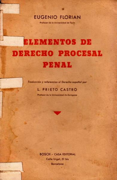 Florian, Eugenio (1869-1945) Elementos de derecho procesal penal / Eugenio Florian (1869-1945) ; Leonardo Prieto Castro, tr. -- Barcelona : Bosch, [1933?]. 514 p.; 22 cm.