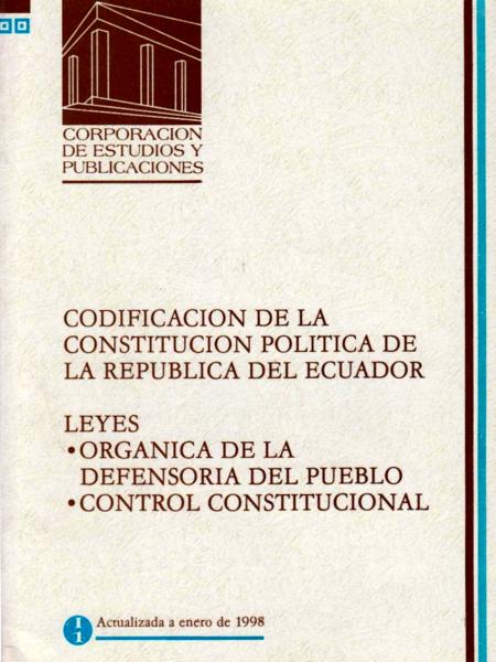 Edit. Ecuador [Constitución] Codificación de la Constitución política de la República del Ecuador / Edit. Ecuador. -- Quito : Corporación de Estudios y Publicaciones, [1998]. 55, 12, 7, 14 p.; 21 cm. -- (Códigos y leyes ; I 1)