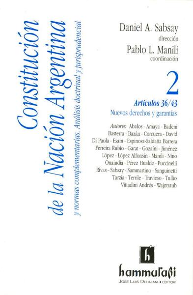 Constitución de la Nación Argentina y normas complementarias: análisis doctrinal y jurisprudencial, 2, artículos 36/43 / Daniel A. Sabsay, dir.; Luis Pablo Manili, coordinación. -- Buenos Aires : Hammurabi, impresión 2010. 797 p.; 23 cm. -- (Constitución de la Nación Argentina y normas complementarias: análisis doctrinal y jurisprudencial / Daniel A. Sabsay, dir.; Luis Pablo Manili, coordinación ; 2)