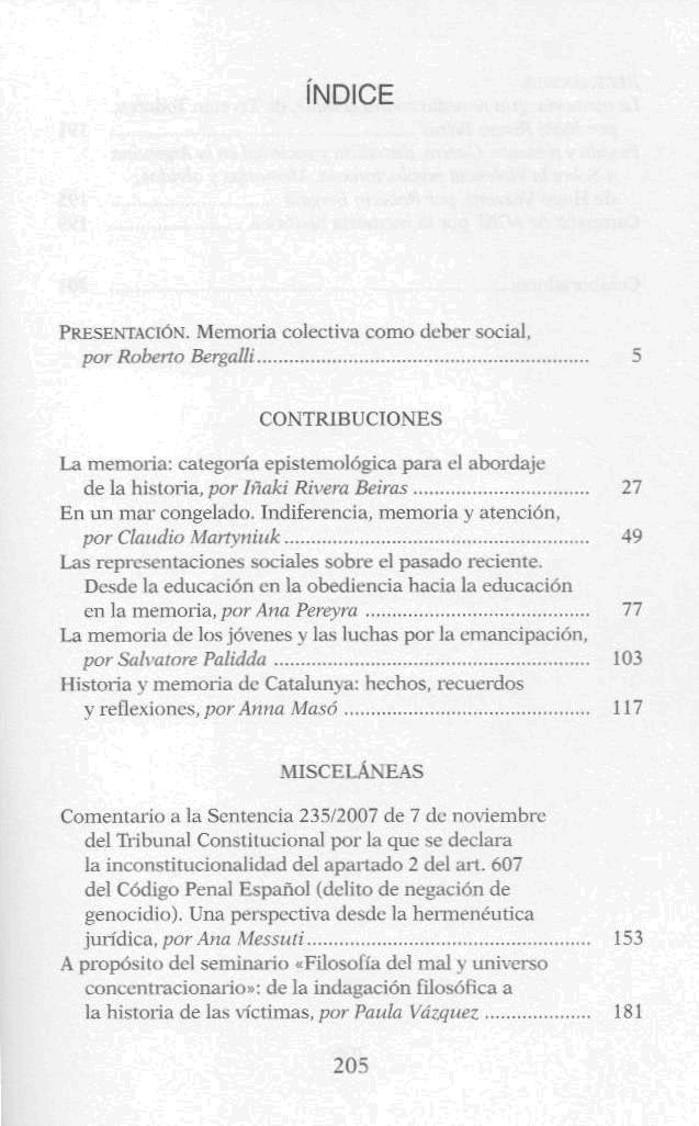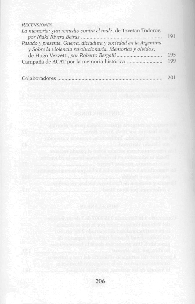 Memoria colectiva como deber social / Roberto Bergalli, coordinador ; Iñaki Rivera Beiras, coordinador. -- 1a. ed. -- Barcelona : Anthropos ; Observatori del Sistema Penal i els Drets Humans de la Universitat de Barcelona, 2010. 206 p.; 18 cm. -- (Huellas, memoria y texto de creación. Desafío(s) ; 8)